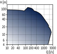 流量,Q: 最大 2500 m3/h 扬程,H: 最高 116 m 泵送液体温度范围: 0°C ~ +40°C 口径: DN 80 ~ DN 500 可通过颗粒直径: 最大 ø145 mm